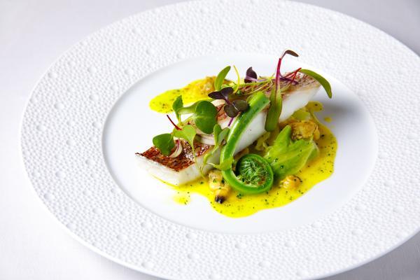 季節の食材を使って、クラシックをベースに洗練されたフレンチの一皿に昇華させるのが中嶋シェフのスタイル。たとえば春の魚料理なら、ふんわりと蒸し焼きにしたマダイに、春キャベツのブレゼ(蒸し煮)を合わせ、アサリの出汁が効いたサフランソースをかけて提供されます。お品書きにはマダイ・アサリ・春キャベツと、食材のみを記載。テーブルに運ばれるまでのワクワク感、料理を目の前に説明を聞けば食欲がさらにアップするというおもてなしも心憎いですね。