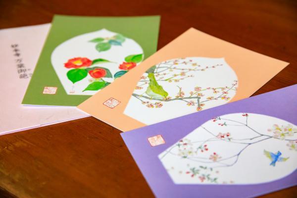 お土産には野の花画家による妙本寺の四季の花々の絵はがきはいかが?春夏秋冬の4種類があり、写真の春バージョンにはツバキ、梅、しだれ桜が柔らかなタッチで描かれています。