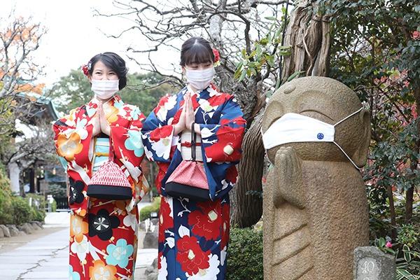 参道沿いに安置された「和み地蔵」。マスクをしている姿がほほえましい♪ほかにも三体連なる良縁地蔵があるので、お参りしながら探してみましょう。