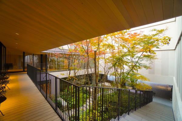 ロビーの屋外にあるテラスは、日本建築の縁側のエッセンスを取り入れて設計されています。夜にはライトアップされた木々が素敵な演出をしてくれます。