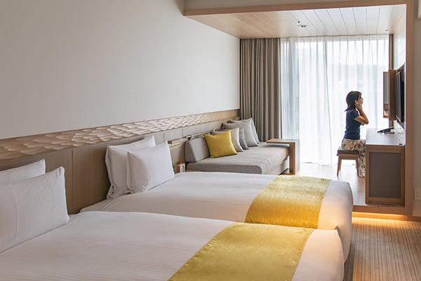 28平方メートルに120cm幅のベッド2台を備えたスーペリアツイン。窓辺に縁側をイメージした小上がりスペースがあるのが特徴です。ゆったりとしたソファはエキストラベッドとして使え、3名でも宿泊OK。三面鏡付きのデスクもメイクする時に便利です。