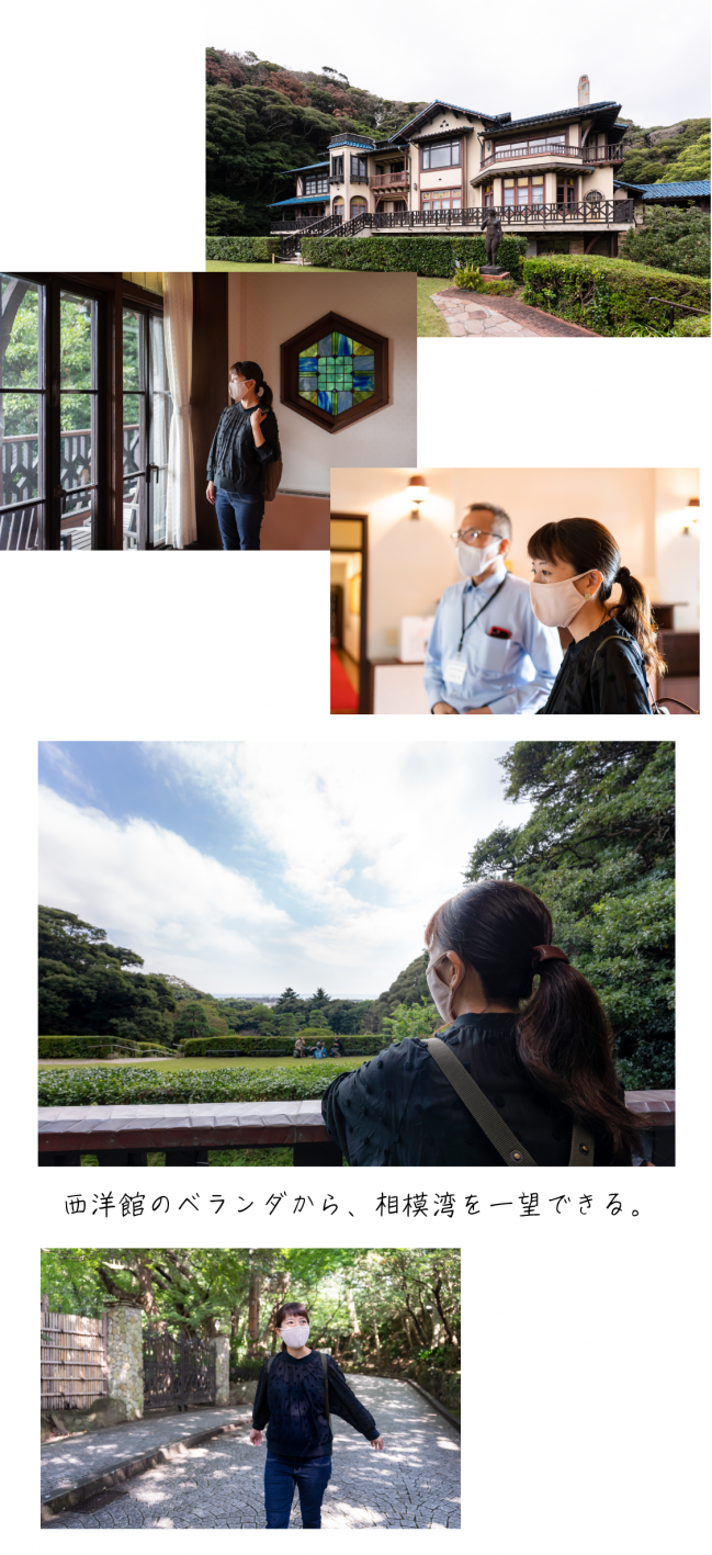 ベランダに出てみると、遠くに由比ヶ浜の海が見渡せた。芝生の広場には、のんびりピクニックを楽しむ家族の姿も。なんておだやかな場所だろう。今度は、春と秋のバラの見頃にあわせてまた来たいと思った。