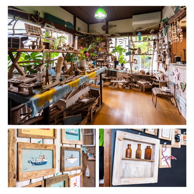 おいしいランチで心もお腹も満たして、次に向かったのは「流木工房 鎌倉島」。海へと続く、細い路地にある小さな工房だ。店内には、様々なサイズの流木を組み合わせてつくられた魚のオブジェや、シーグラスと流木でつくられた時計、木のフレームに飾られた船の模型など、オリジナリティ溢れるアイテムの数々が並んでいる。