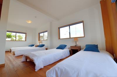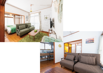 わさび色を特徴とした大きな日本家屋を一棟貸し!広い4部屋のベッドルームと床の間付きリビング、大勢で囲んでいただけるテーブルを備えたキッチンには自炊可能な調理器具、電化製品を完備。その他、真っ白で清潔な洗面所が2箇所、浴槽付きのバスルーム以外に2つのシャワールーム、3つのトイレと玄関横にはソファーベッド付きの小部屋もあります。最大10名様が贅沢に過ごしていただけるお宿です。