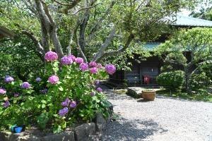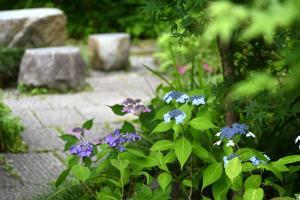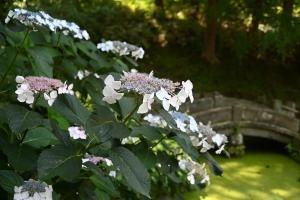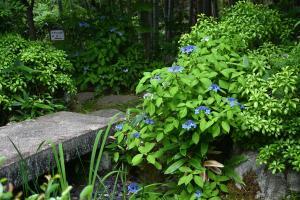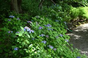 浄明寺地区にある一条恵観山荘。ヤマアジサイが見頃です。滑川(なめりかわ)のせせらぎを聞きながら、竹林やアカマツのある庭園の風情をゆっくりと味わえます。 一部のアジサイが見頃、アナベルはまだ蕾です(画像なし)。