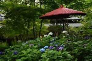 境内は山門から仏殿にかけての右側の通路は、色とりどりのアジサイに彩られています。鷺池(びゃくろち)のほとりのアジサイも見頃です