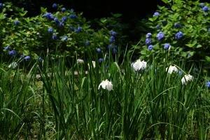 アジサイの色づきがすすみ、すっかり見頃になりました。有名な参道石段のほか、境内全体を埋めつくすように咲く明月院ブルーといわれる水色に、訪れた多くの人々が魅了されていました。 本堂後庭園では真っ白なハナショウブが見頃を迎え、あじさいとの共演が美しいです。