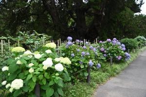 参道から境内にかけて随所に植えられたアジサイが見頃です。珍しいシホウチクの竹林の傍らにも咲いていました。