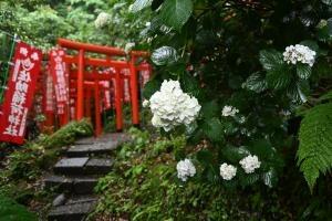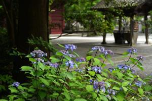 境内の随所にある鉢植えや地植えの様々なアジサイが見頃になっています。境内左手の隅にひっそりと花を咲かせているヤマアジサイもお見逃しなく。