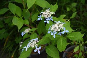 様々な地植えや鉢植えのヤマアジサイが楽しめます。1枚目は普賢の華、2枚目は剣の舞錦という品種です。