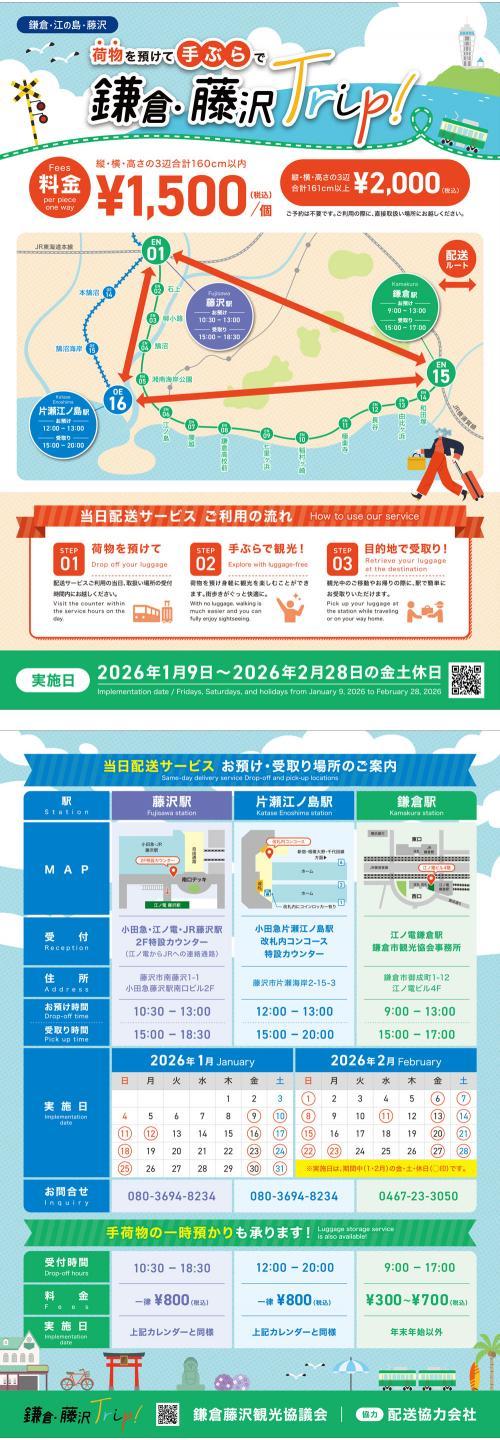 鎌倉藤沢観光協議会は、1月~2月の金・土・日・祝日限定で、多くの観光客が行き来する鎌倉―江の島・藤沢間の当日手荷物相互配送第2弾を実施します。