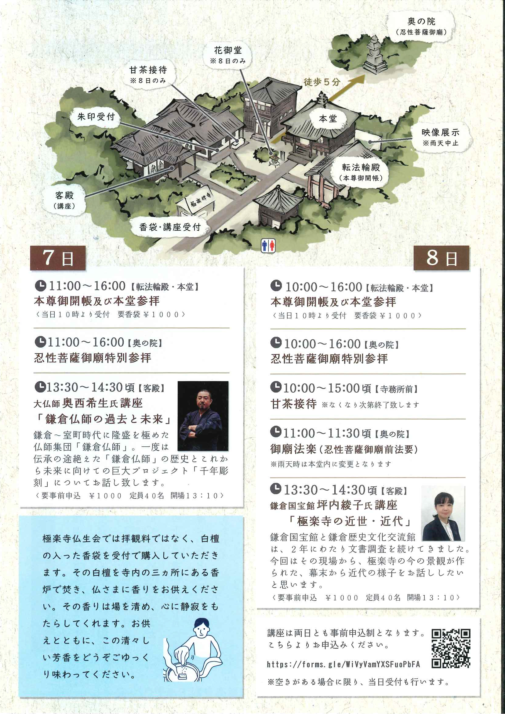 | 実施内容 | 【本尊御開帳及び本堂参拝】 7日:11時00分~16時00分 8日:10時00分~16時00分 極楽寺創建より伝わる転法輪伝内の本尊釈迦如来立像(国重要文化財)を御開帳。また、本堂の忍性菩薩像や興性菩薩像もあわせて参拝できます(要焼香購入:1,000円)。 ※当日10時より受付 【忍性菩薩御廟特別参拝】 7日:11時00分~16時00分 8日:10時00分~16時00分 貧者や病人の救済に身命を惜しまぬ努力をされた極楽寺開山忍性菩薩。今も奥の院に遺る墓塔 五輪塔(国重要文化財)を参拝できます。 【講座「鎌倉仏師の過去と未来」大仏師 奥西 希生 氏】 7日:13時30分~14時30分頃 鎌倉~室町時代に隆盛を極めた仏師集団「鎌倉仏師」。一度は伝承の途絶えた「鎌倉仏師」の歴史とこれから未来に向けての巨大プロジェクト「千年彫刻」についてお話し致します。 ※要事前申し込み 1,000円 定員40名 開場13:10 【花御堂(灌仏会/花祭り)】 8日:10時00分~16時00分 釈尊の降誕のとき、龍が天から降りてきて香湯を灌いだという説(摩訶刹経)に依って、毎年誕生日の4月8日に誕生仏に甘茶をそそぐ法会。 花々に飾られた花御堂の中にいらっしゃる誕生仏に甘茶を灌ぎお祝いしましょう。 【甘茶接待】 8日:10時00分~15時00分頃 ※なくなり次第終了 お釈迦様誕生のとき、天も祝福し甘露の雨を降らせたと云われています。その故事にちなみ甘茶を差し上げています。 【御廟法楽】 8日:11時00分~11時30分頃 忍性菩薩御廟前で法要を行い、皆様と共に読経します。 ※雨天時は本堂で行います。 【講座「極楽寺の近世・近代」鎌倉国宝館 坪内 綾子氏」 8日:13時30分~14時30分頃 鎌倉国宝館と鎌倉歴史文化交流館は、2年にわたり文書調査を続けてきました。今回はその現場から、極楽寺の今の景観が作られた、幕末から近代の様子をお話ししたいと思います。 ※要事前申し込み 1,000円 定員40名 開場13:10 |