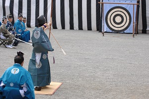 神事に用いられる的は直径5尺2寸(約156センチ)もあり、この神事は「大的式」ともいわれます。この大きな的の裏に「鬼」という文字を封じ込めて、15間(約27メートル)離れたところから的に矢を射込み、鬼を祓います。神事は鎌倉時代の武士の礼装で、古式に従い、厳粛に行われます。