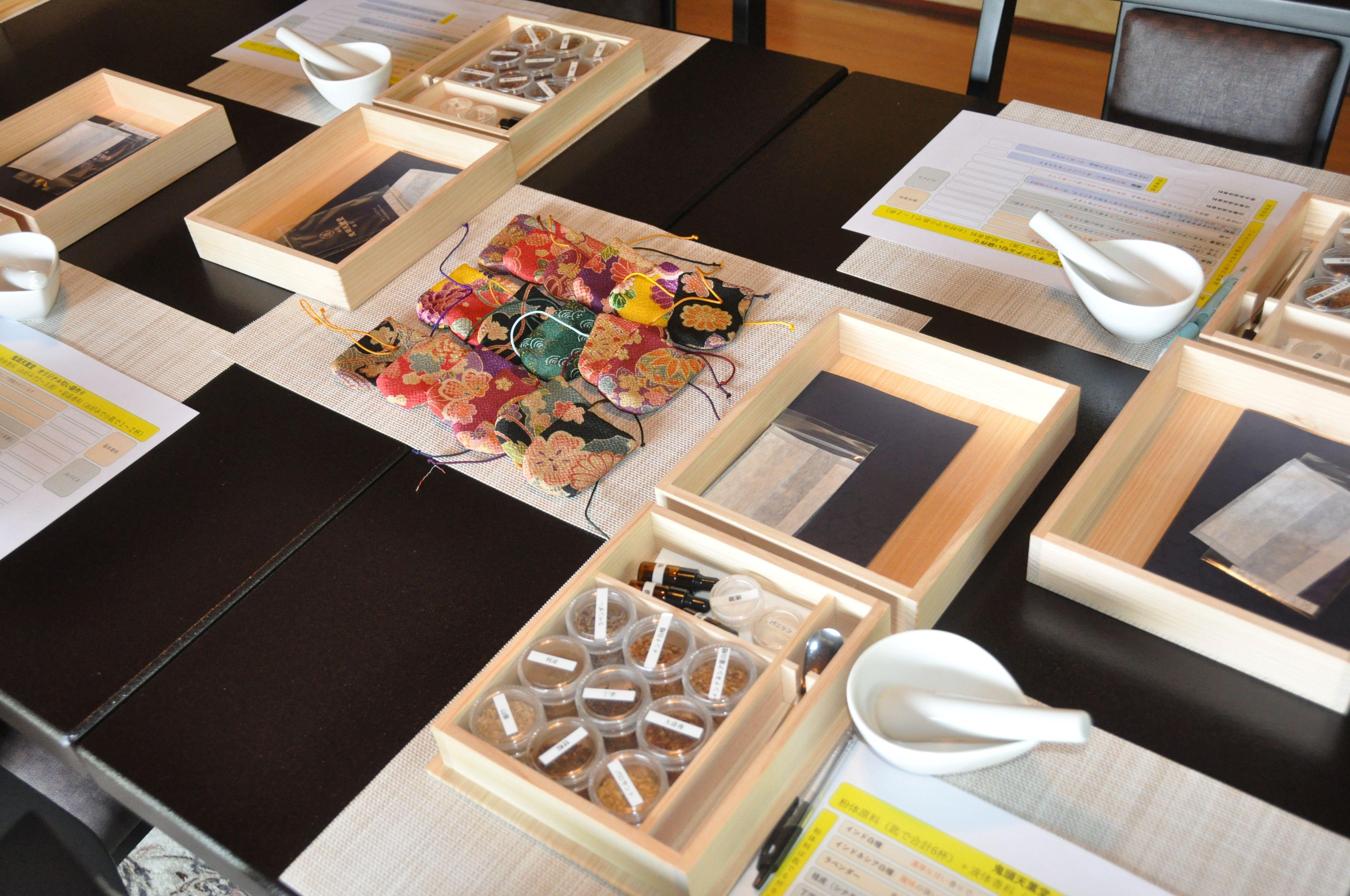 貴重な白檀・沈香の香りを聞いていただき、日本古来の美意識が感じられるオリジナルの匂い袋作りを体験していただきます。